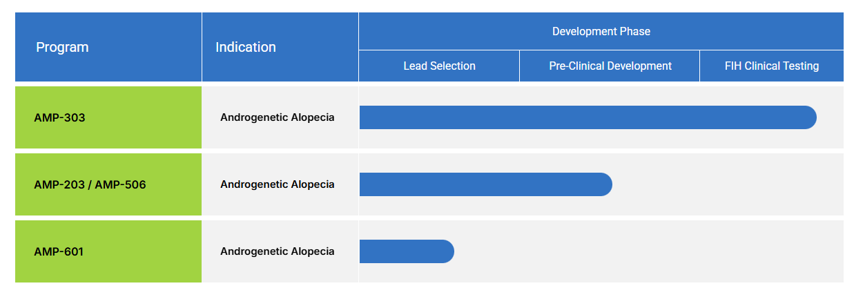 Its lead candidate, currently in first-in-human trials, is AMP-303. Additional compounds include AMP-203/506, an osteopontin-based compound, and AMP-601, a SCUBE-3-based compound.[2]Amplifica. Pipeline. Developing novel injectable treatments to address androgenetic alopecia. Available at: https://amplificabio.com/pipeline/ (Accessed: April 2026) All of these treatments remain investigational at the time of writing.