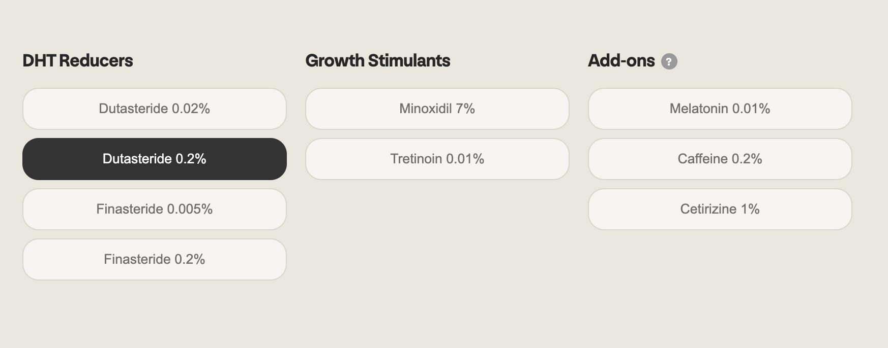 When it comes to incorporating these clinically validated ingredients into effective treatments, Ulo prioritizes customizability rather than relying on high-strength, one-size-fits-all topical formulations. Ulo offers both low-dose and full-strength versions of topical finasteride and dutasteride, with optional additions such as higher-strength minoxidil, tretinoin, caffeine, melatonin, or cetirizine, depending on individual needs and tolerability.