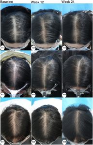 Figure 2: Images of hair density at baseline and following 24 weeks of daily treatment with either 100 mg spironolactone and 3% topical minoxidil or a placebo and topical 3% minoxidil. Adapted from Figure 3.[11]Werachattawatchai, P., Khunkhet, S., Harnchoowong, S., Lertphanichkul, C. (2025). Efficacy and safety of oral spironolactone for female pattern hair loss in premenopausal women: a randomized, … Continue reading Image obtained in line with the Creative Commons License.