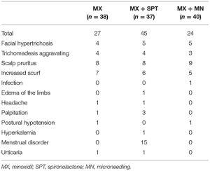 Figure 5: Side effects recorded across patients receiving minoxidil (MN), minoxidil and spironolactone (SPT), or minoxidil and microneedling (MN) treatment. Adapted from Table 5.[23]Liang, X., Chang, Y., Wu, H., et al. (2022). Efficacy and Safety of 5% Minoxidil Alone, Minoxidil Plus Oral Spironolactone, and Minoxidil Plus Microneedling on Female Pattern Hair Loss: A … Continue reading Image obtained in line with the Creative Commons License.