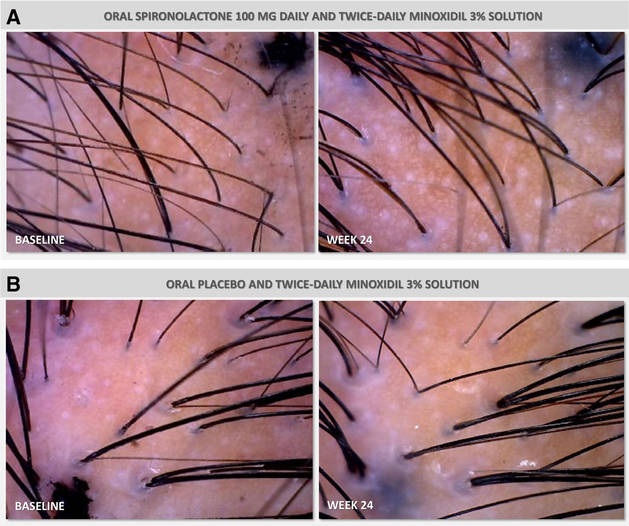Figure 2: Images of hair density at baseline and following 24 weeks of daily treatment with either 100 mg spironolactone and 3% topical minoxidil or a placebo and topical 3% minoxidil. Adapted from Figure 3.[11]Werachattawatchai, P., Khunkhet, S., Harnchoowong, S., Lertphanichkul, C. (2025). Efficacy and safety of oral spironolactone for female pattern hair loss in premenopausal women: a randomized, … Continue reading Image obtained in line with the Creative Commons License.