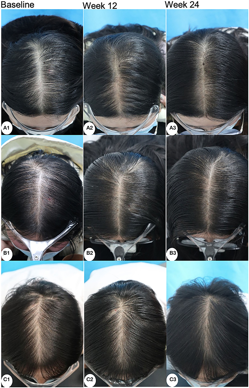 Figure 4: Scalp images of patients treated with 5% minoxidil alone (A1-A3), 5% minoxidil and spironolactone (B1-B3), or 5% minoxidil and microneedling (C1-C3) at baseline, week 12, and week 24. Adapted from Figure 5.[14]Liang, X., Chang, Y., Wu, H., et al. (2022). Efficacy and Safety of 5% Minoxidil Alone, Minoxidil Plus Oral Spironolactone, and Minoxidil Plus Microneedling on Female Pattern Hair Loss: A … Continue reading Image obtained in line with the Creative Commons License.