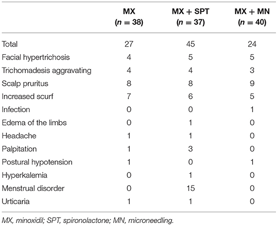 Figure 5: Side effects recorded across patients receiving minoxidil (MN), minoxidil and spironolactone (SPT), or minoxidil and microneedling (MN) treatment. Adapted from Table 5.[23]Liang, X., Chang, Y., Wu, H., et al. (2022). Efficacy and Safety of 5% Minoxidil Alone, Minoxidil Plus Oral Spironolactone, and Minoxidil Plus Microneedling on Female Pattern Hair Loss: A … Continue reading Image obtained in line with the Creative Commons License.