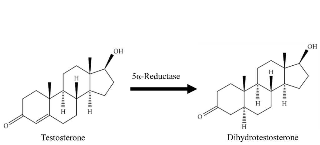 Figure 1. 5α-reductase converts testosterone into dihydrotestosterone. Finasteride is a 5α-reductase inhibitor, meaning it prevents or reduces this activity. Image adapted from Figure 1.[4]Azizi, A., Mumin, N. H., & Shafqat, N. (2021). Phytochemicals with anti 5-alpha-reductase activity: A prospective for prostate cancer treatment. F1000Research. 10. 221. Available at: … Continue reading Image used under Creative Commons License.