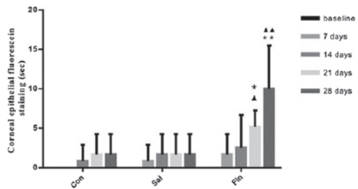 Figure 3. Finasteride treatment (Fin – right-hand group) increases fluorescein staining in the tears of rats, an indicator of tear break-up. Adapted from Figure 1.[12]Li, K., Zhang, C., Yang, Z., Wang, Y., & Si, H. (2017). Evaluation of a novel dry eye model induced by oral administration of finasteride. Molecular Medicine Reports. 16(6). 8763-8770. Available … Continue reading Image used under Creative Commons License.