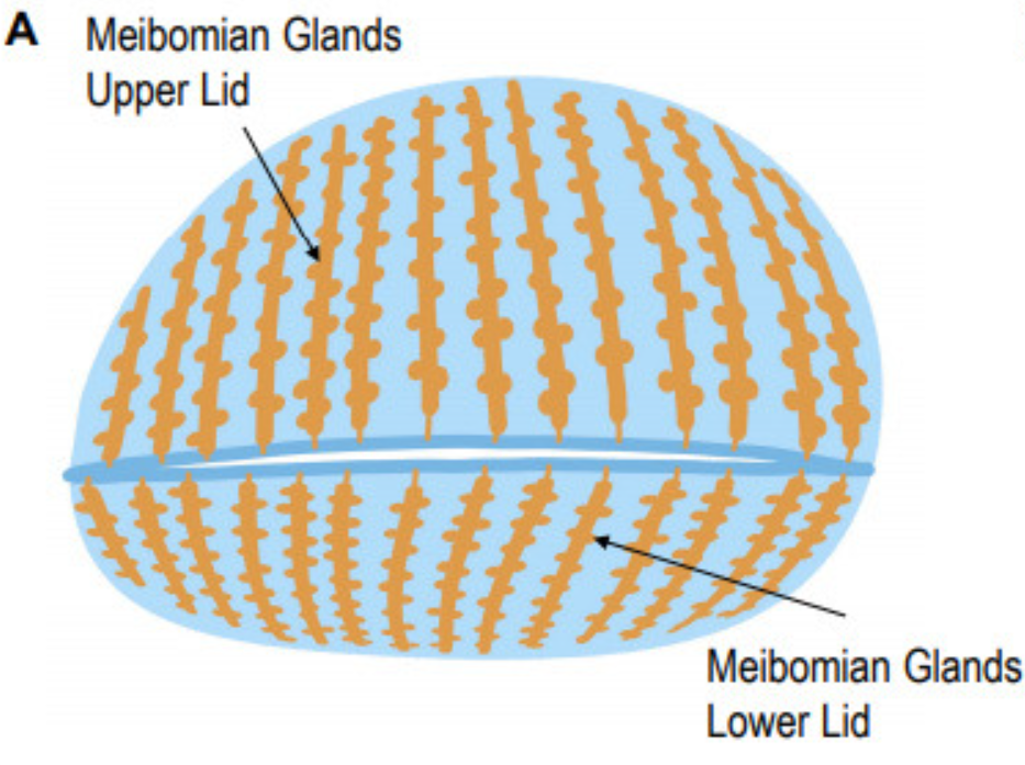Figure 2. The meibomian glands are arranged in parallel rows within the upper and lower eyelids. They produce meibum, which forms the lipid layer of the tear that coats the surface of the eye. Image adapted from Figure 3.[6]Dhamdhere, K., & Badawi, D. (2021). A blink-assisted, cornea-sparing wearable eyelid device for the effective penetration of therapeutic thermal energy into the meibomian glands for the treatment … Continue reading Image used under Creative Commons License.