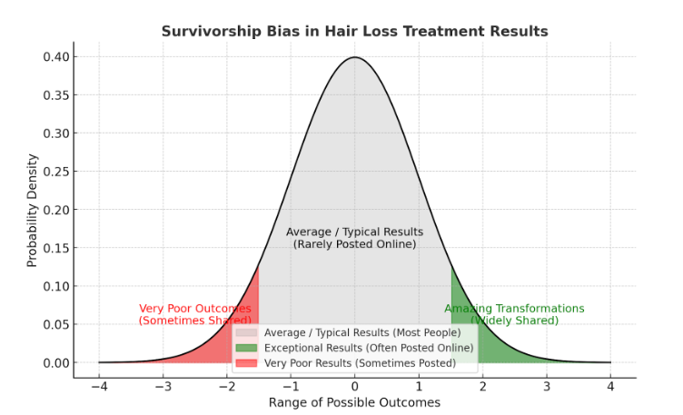 Figure 4: Survivorship bias skews perception of hair loss treatments. Online accounts often highlight extreme outcomes, either exceptional success or very poor results, while the typical, average outcomes experienced by most remain underrepresented.