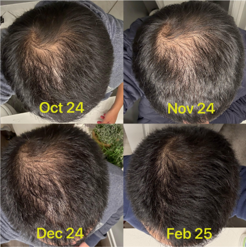 This male had crown-predominant thinning with a stable hairline at baseline. His core regimen is a single combined solution containing minoxidil 5% and finasteride 0.1%, applied to the crown only. He did not report any microneedling or supplementation. He reported that shedding began around week 3 and was “heavy” for approximately 4 weeks. The shedding tapered and largely stopped at the 2.5-month mark. By month 4, he achieved visible crown regrowth and thickening compared to the baseline, despite the application being limited to the crown. He perceived an increase in overall density and did not report any side effects.