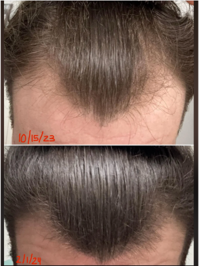 This user had thinning at the hairline and vertex areas of the scalp and began treatment to improve hair density and maintenance. He applied a single compounded solution (Novegrow) containing minoxidil 5% and finasteride 0.1%, once nightly, for three months before reporting on progress. Additionally, he dermarolled his scalp with a 0.5 mm needle twice weekly and supplemented with daily biotin and a multivitamin. He reported mild shedding in the first two weeks of therapy, and by month 3, he noted visible thickening and improved coverage. He did not report any side effects and added that the once-daily schedule was practical and helped with adherence.