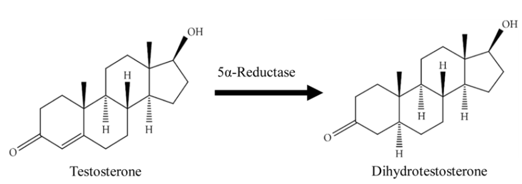 Figure 1. 5α-reductase converts testosterone into dihydrotestosterone. Finasteride is a 5α-reductase inhibitor, meaning it prevents or reduces this activity. Image adapted from Figure 1.[2]Azizi, A., Mumin, N. H., & Shafqat, N. (2021). Phytochemicals with anti-5-alpha-reductase activity: A prospective for prostate cancer treatment. F1000Research. 10. 221. Available at: … Continue reading Image used under Creative Commons License.