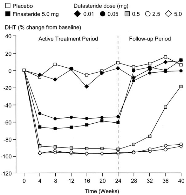 Figure 1: Change in DHT from baseline. Dutasteride vs. finasteride.[5]Clark, R.V., Hermann, D.J., Cunningham, G.R., Wilson, T.H., Morrill, B.B., Hobbs, S. (2004). Marked Suppression of Dihydrotestosterone in Men with Benign Prostatic Hyperplasia by Dutasteride, a Dual … Continue reading