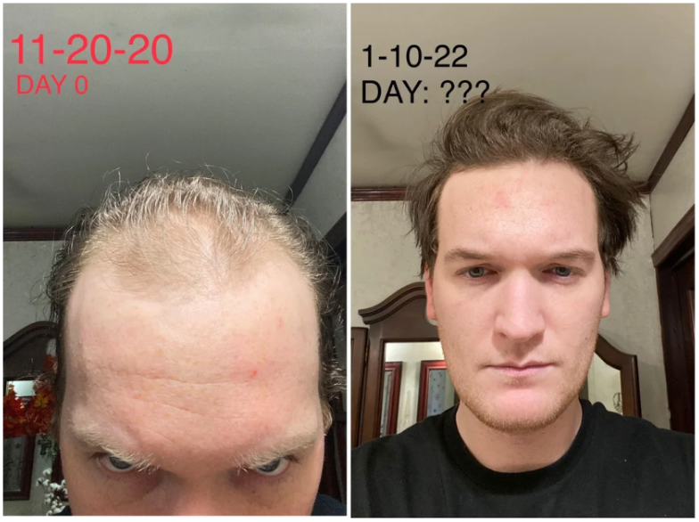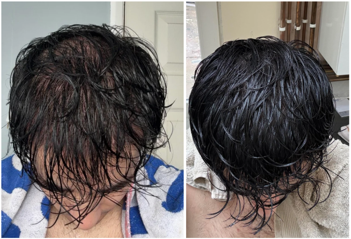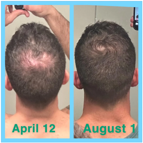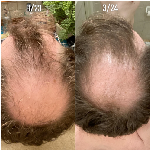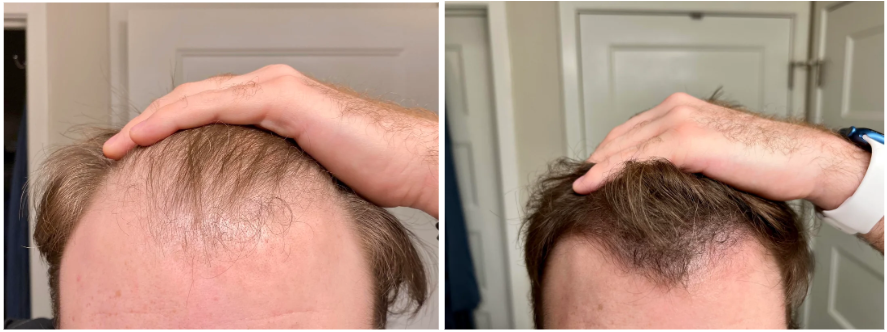 The patient noted a strong early response, but felt his results peaked roughly halfway into treatment. He stopped minoxidil for 1 month and missed some doses in the months leading up to the post. His photos indicated a significant improvement in density compared to baseline, particularly at the hairline and the top. He noted more coverage at the crown but felt it was still noticeably weaker than desired. The patient reported no sexual side effects or skin issues.