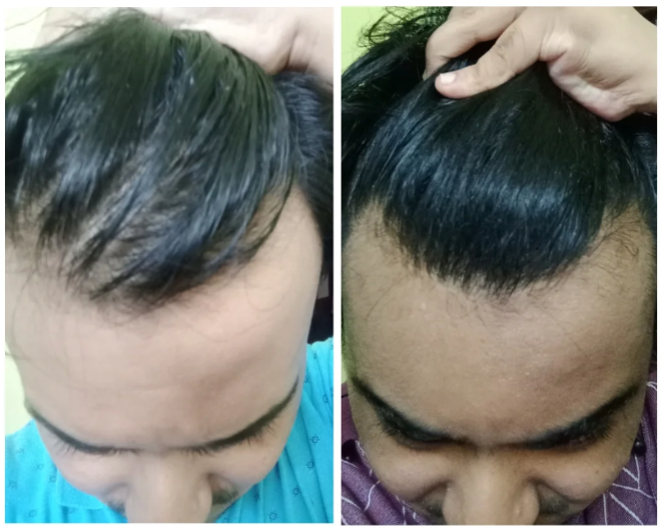 He noted a mild shedding phase in the first month of treatment. By month 2, he described the first visible tiny regrowth after a buzz cut, by which point the shedding had reduced. Overall, the patient described early regrowth at the hairline and thinning zones. He reported no side effects on finasteride 1 mg daily, stating that libido and energy have remained unchanged or improved.