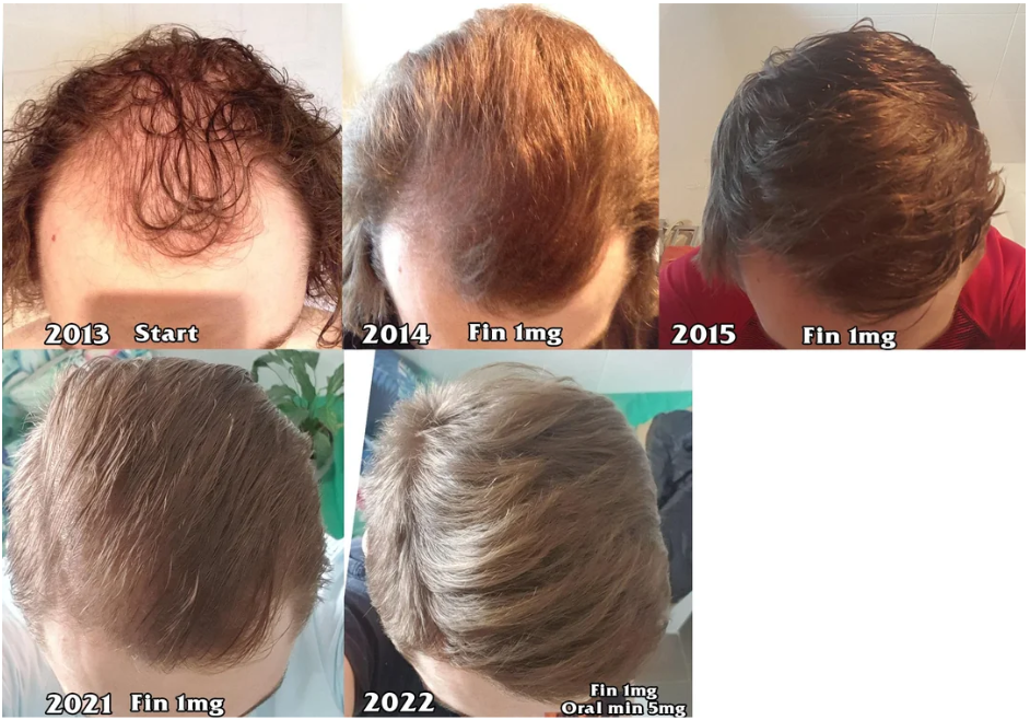 He reported good tolerance to finasteride with no noticeable side effects. He added that oral minoxidil caused mild generalized hypertrichosis (slightly darker chest/back hair, fuller beard, higher cheek/temple hairs), but was otherwise tolerated.
