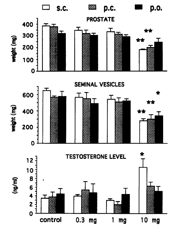 In intact rats, strong androgen-dependent effects were generally absent up to 1 mg/rat regardless of route of administration, but became apparent at 10 mg/rat. Testosterone increases were noted only after subcutaneous dosing at the highest dose. This suggests endocrine feedback can occur when systemic exposure is sufficiently high.