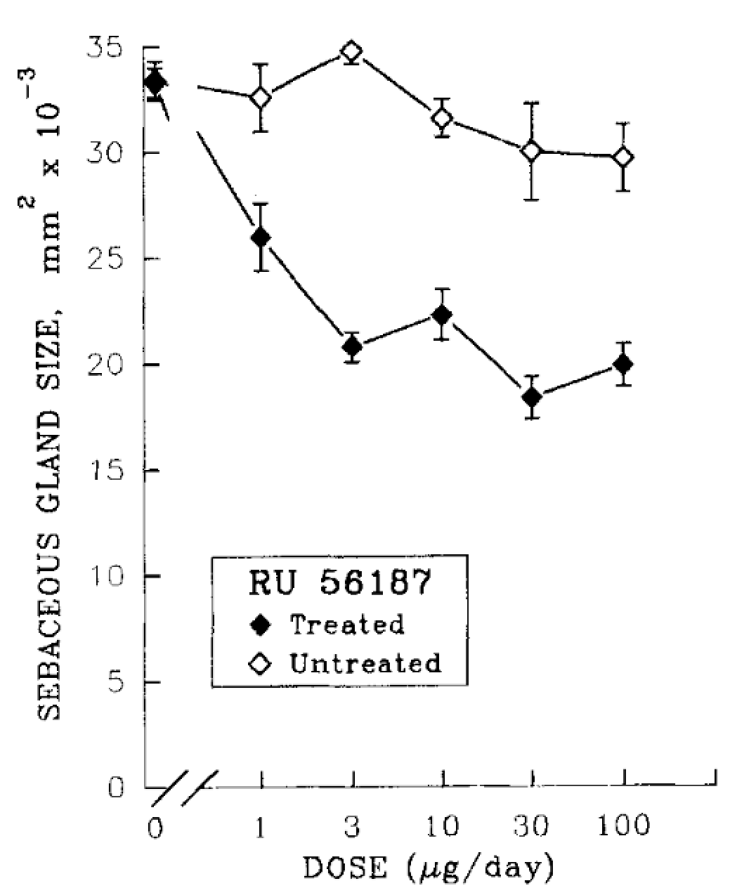 Figure 2. RU58841 and its effects on sebaceous gland sizing: a dose-dependent study. Adapted from Figure 2.[11]Matias, J.R., Gaillard, M. (1995). Local Inhibition Of Sebaceous Gland Growth By Topically Applied RU 58841. Annals of the New York Academy of Sciences. 761. 56-65. Available at: … Continue reading