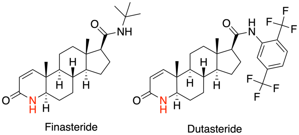 Figure 1. The structures of finasteride and dutasteride.[2]Wikimedia Commons. (n.d.). Azasteroid Pharmaceuticals [Image]. *Wikimedia Commons.* Available at: https://commons.wikimedia.org/wiki/File:Azasteroid_Pharmaceuticals.png (Accessed: November 2025) Image in the Public Domain.