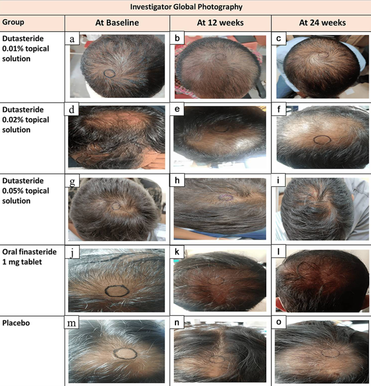| ↑16, ↑20 | Panuganti, V.K., Kumar Madala, P., Ramalingayya Grandhi, V., Varma Alluri, C., Mohammad, J., Rao, K.S.S.V.V., Reddy Dundigalla, M., (2025). A Randomized, Double-Blind, Placebo and Active Controlled Phase II Study to Evaluate the Safety and Efficacy of Novel Dutasteride Topical Solution (0.01%, 0.02%, and 0.05% w/v) in Male Subjects With Androgenetic Alopecia. Cureus. 17(8). e89309. Available at: https://doi.org/10.7759/cureus.89309 |