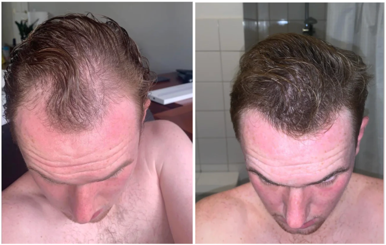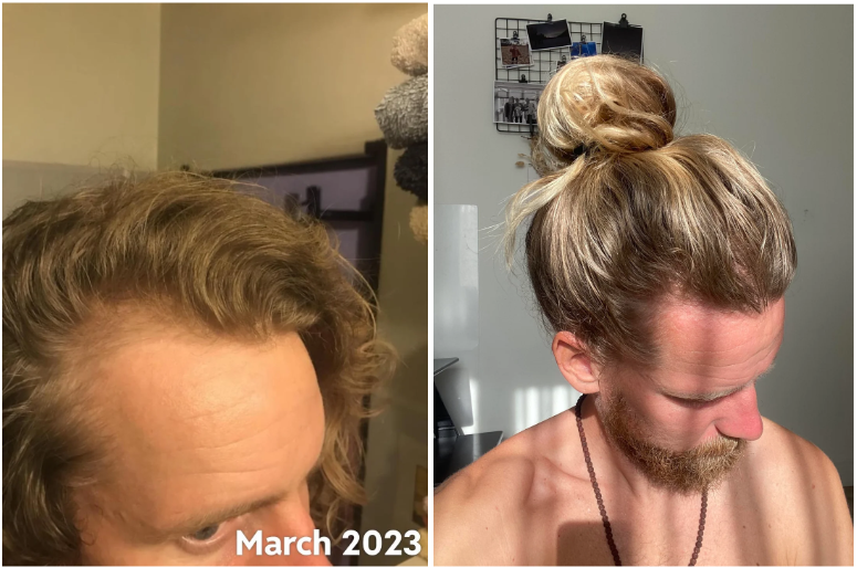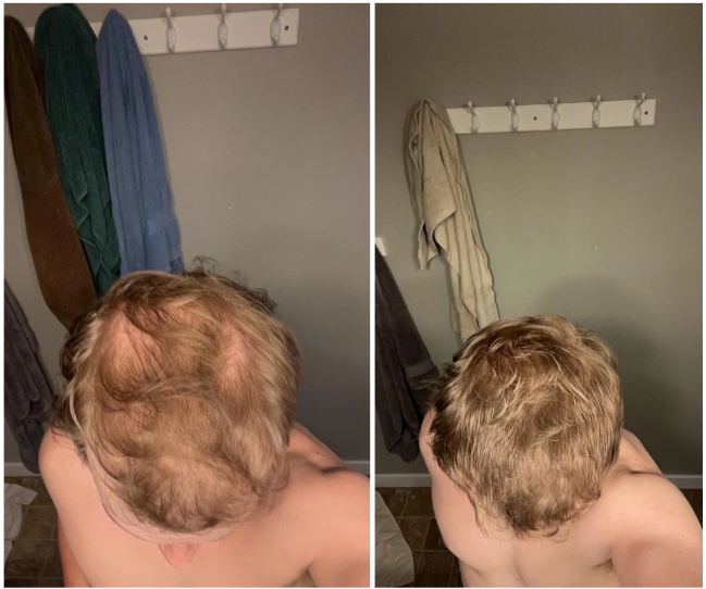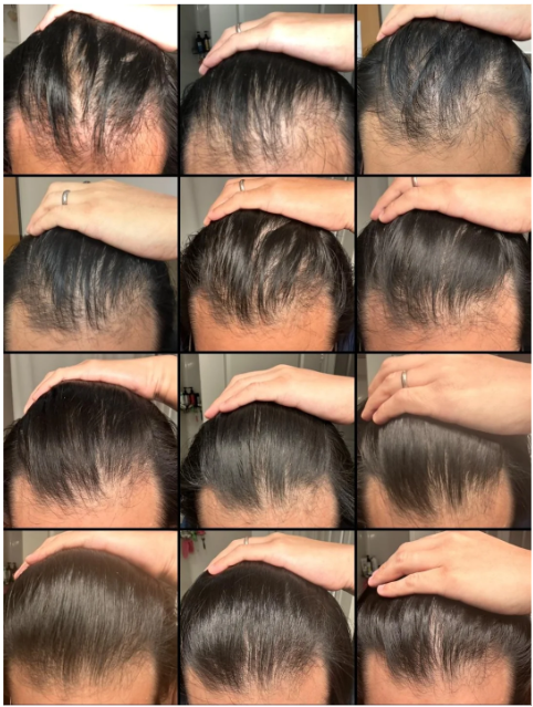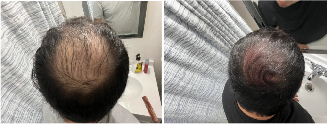 This 34-year-old male had tried numerous natural and supplement-based approaches (including pumpkin seed oil, saw palmetto, and rosemary) without success before starting pharmacologic therapy. He used a topical finasteride 0.3% spray compounded with topical minoxidil 6%, applied twice daily. He additionally used microneedling (1.5 mm depth) every 10 days. He described the first 2 months as a “rough” period, marked by noticeable shedding and even mild chest tenderness.