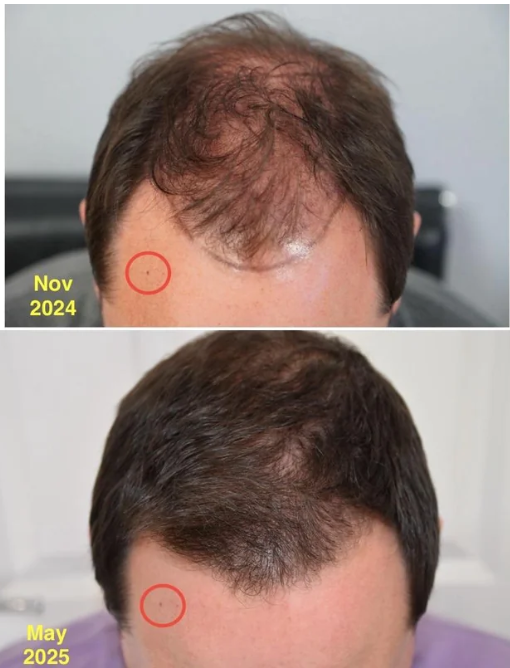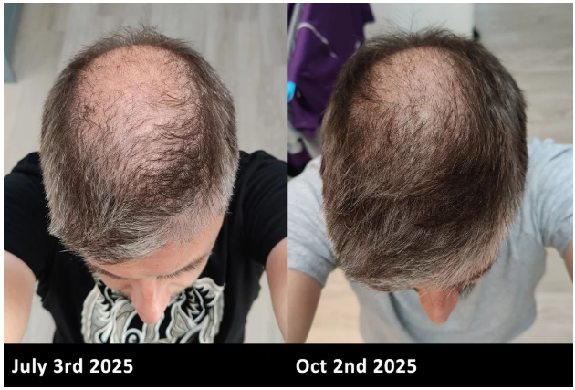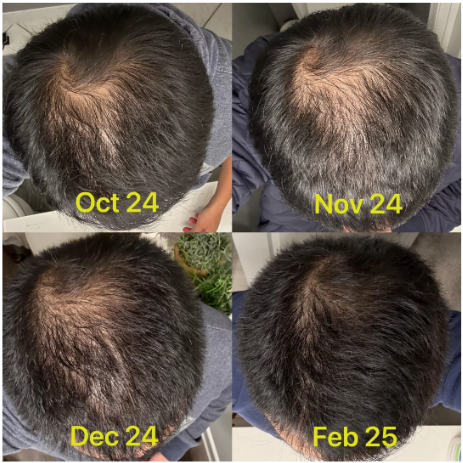 At months 3-6, he noted steady improvement and early thickening, especially near the temples and mid-scalp. By months 7-8, he observed significant progress, and in months 9-12, coverage stabilized, with occasional light shedding cycles. At this point, he transitioned to an oral regimen for convenience.