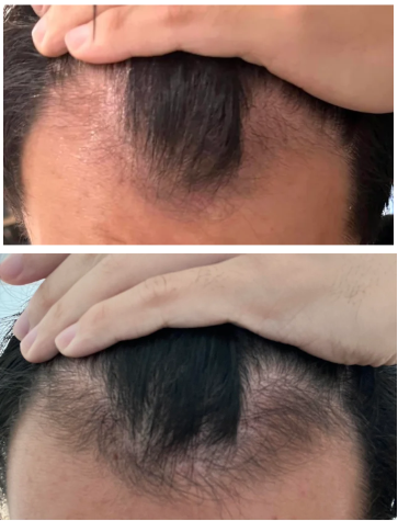 This 24-year-old male started the topical combination of finasteride 0.3% and minoxidil 6%, applied mainly to his hairline and temples via a serum. He did not observe any side effects, save for transient greasiness and a distinct smell from the serum. Between baseline and month 4 of therapy, he reported visible baby hairs and an early fill across his hairline. He did not notice any shedding across the 4 months.
