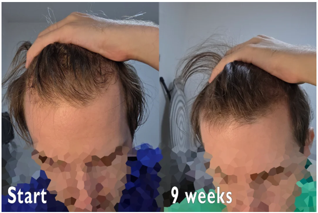 This male documented his results after 9 weeks on low-dose topical finasteride combined with minoxidil. He created a 0.02% topical finasteride solution using crushed finasteride tablets, which he took from month 2 after initially trialing a 0.01% solution. He also applied a 5% minoxidil solution with a standard alcohol-based carrier. He noted a brief shedding phase at week 4 of the protocol, which he interpreted as a positive response indicator. From weeks 6-9, he noted visible regrowth at the front and thickening of the crown. He did not note any systemic or dermatologic adverse events.