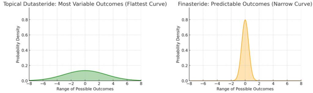 Figure 1: For topical dutasteride, a wide, shallow curve represents a much wider spread of outcomes. For finasteride, a narrow bell curve shows predictable outcomes.