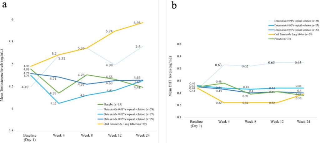 Taken together, this creates a tension: the study’s claim that 1 mL of 0.05% topical dutasteride daily can outperform 1 mg oral finasteride on average, without meaningful systemic effects, does not match what we see in practice or what we would expect based on dutasteride pharmacology.
