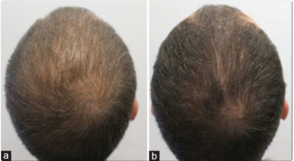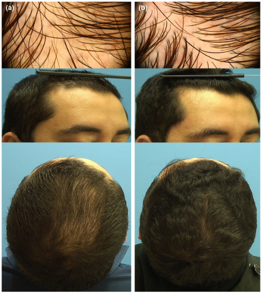 Figure 13: Androgenetic alopecia in a 33-year-old man before (a) and after (b) treatment with dutasteride injections through 6 months with a one-session treatment every 3 months.[23]Saceda-Corralo, D., Rodrigues-Barata, A.R., Vano-Galvan, S., Jaen-Olasolo, P. (2017). Mesotherapy with Dutasteride in the Treatment of Androgenetic Alopecia. International Journal of Trichology. … Continue reading