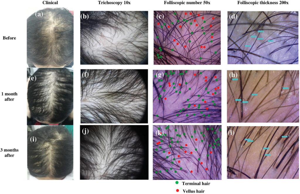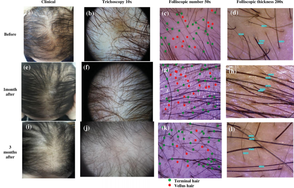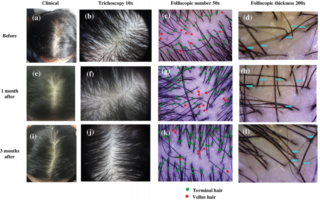 Hair density and shaft diameter were assessed by trichoscopy at baseline and again 8 weeks after the final session (i.e., roughly 6 months from baseline), alongside a hair pull test and patient-reported satisfaction scores. By the end of follow-up, frontal and vertex hair density increased significantly (p<0.001), hair shaft diameter improved in both regions (vertex p<0.001; frontal p=0.046), and pull test counts nearly halved (p<0.001), pointing to both regrowth and reduced shedding.