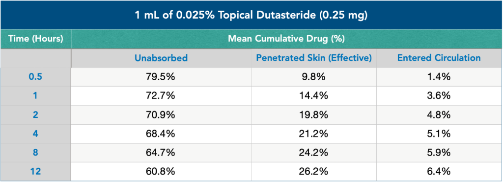 A recent analysis measured how much of a 1 mL solution of 0.025% dutasteride (i.e., 0.25mg) applied to the scalp (1) stayed on the skin, (2) penetrated into the dermis, and (3) travelled systemically into the bloodstream.