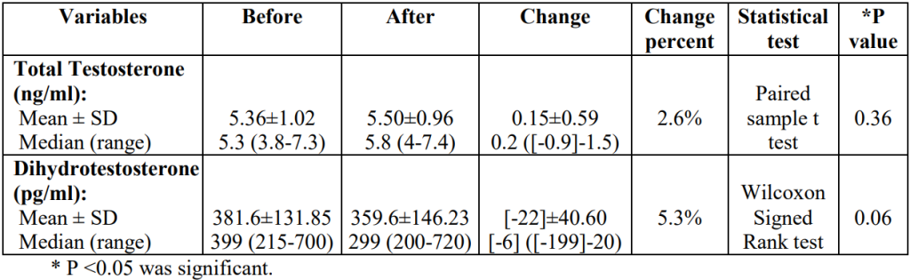 Figure 11: Changes from baseline to week 24 in (a) testosterone levels and (b) DHT levels.[20]Panuganti, V.K., Madala, P.K., Grandhi, V.R., Alluri, C.V., Mohammad, J., KSSVV, S.R., Dundigalla, M.R. (2025). A Randomized, Double-Blind, Placebo and Active Controlled Phase II Study to Evaluate … Continue reading