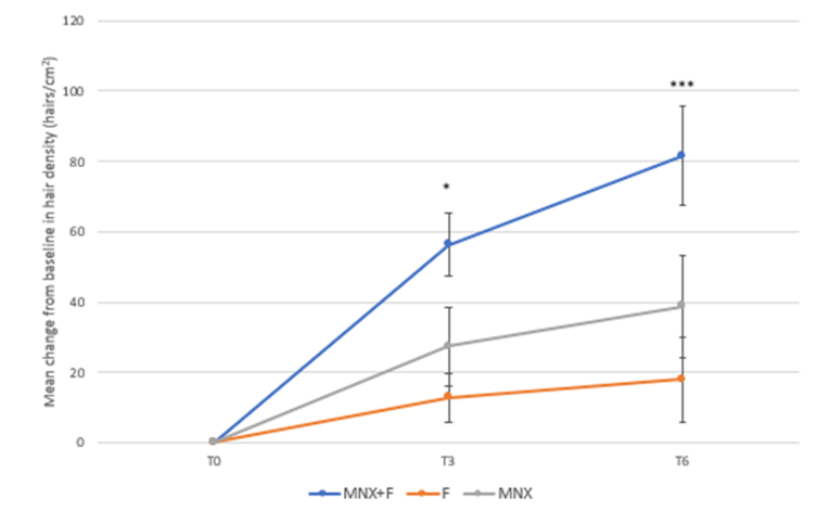 Figure 5. The combination of minoxidil and finasteride (MNX+F; blue line) shows improved hair density compared to both finasteride (F; orange line) and minoxidil (MNX; gray line) after 3 months and 6 months of treatment. Adapted from Figure 2.[23]Rossi, A., Caro, G. (2023). Efficacy of the Association of Topical Minoxidil and Topical Finasteride Compared to Their Use in Monotherapy in Men with Androgenetic Alopecia: A Prospective, Randomized, … Continue reading Image used under Creative Commons license.